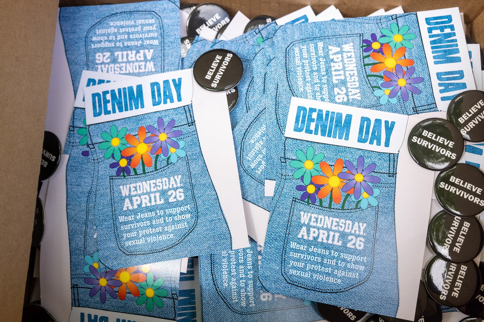 This poster was designed to inform fellow students about Denim Day. It was created for MSCH-J365 Graphic Design and used by the IU’ Student Health Center for Denim Day marketing (picture of the printed flyers given out to IU students below).
